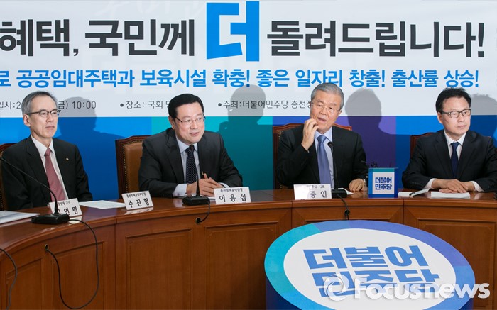 (서울=포커스뉴스) 이용섭 더불어민주당 총선정책공약단장이 4일 오전 서울 여의도 국회에서 열린 '국민연금 혜택, 국민께 더 돌려드리겠습니다 - 정책공약단 공약발표'에 참석해 인사말을 하고 있다. 왼쪽부터 주진형 부단장, 이 단장, 김종인 비대위 대표, 박광온 의원.