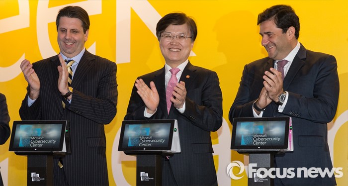 (서울=포커스뉴스) 4일 오전 서울 종로구 한국마이크로소프트에서 열린 '사이버보안센터 개관식'에서 마크 리퍼트(왼쪽부터) 주한미대사, 최양희 미래창조과학부 장관, 세자르 세르누다 마이크로소프트 아시아태평양 지역 사장이 디지털 커팅을 마치고 박수를 치고 있다.