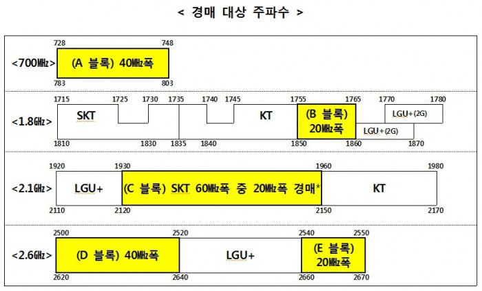 이번에 경매에 나온 주파수는 700㎒ 대역 40㎒폭, 1.8㎓ 대역 20㎒폭, 2.1㎓ 대역 20㎒폭, 2.6㎓ 대역 40㎒폭 및 20㎒폭 등 5개 블록, 총 140㎒폭이다. 700㎒, 2.6㎓ , 2.1㎓ 대역 등 광대역화가 가능한 대역은 사업자 별로 1개 이상 할당 받을 수 없도록 제한했다. 사업자들은 최대 60㎒폭까지만 할당 받을 수 있도록 했다.