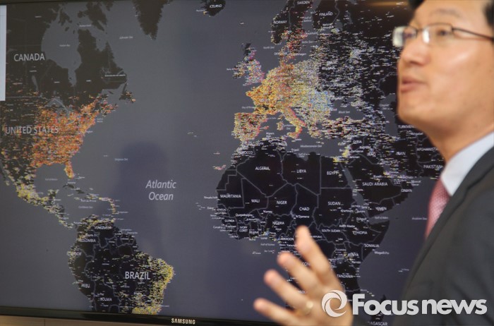 (서울=포커스뉴스) 4일 오전 서울 종로구 한국마이크로소프트에서 열린 '사이버보안센터 개관식'에서 직원들을 비롯한 관계자들이 MALWARE(악성코드) 분포도를 확인하고 있다.