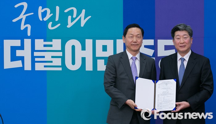 (서울=포커스뉴스) 4일 오후 서울 여의도 국회에서 열린 더불어민주당 인재영입 기자회견에 참석한 김상곤(왼쪽) 인재영입위원장이 윤종기 전 인천경찰청장으로부터 입당원서를 전달받은 뒤 취재진을 향해 포즈를 취하고 있다.