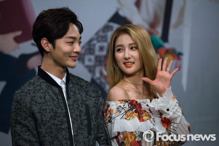 (서울=포커스뉴스) 배우 김민재와 걸그룹 포미닛 멤버 남지현이4일 오후 서울 마포구 상암동 MBC 신사옥에서 열린 MBC 드라마 '마이 리틀 베이비' 제작발표회에 참석, 취재진을 향해 포즈를 취하고 있다.