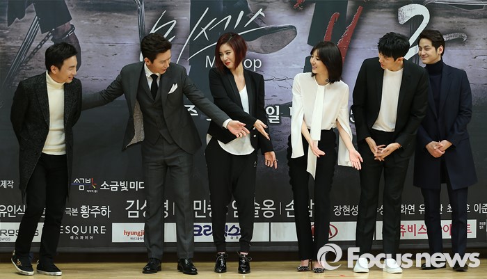 (서울=포커스뉴스) 4일 오후 서울 양천구 SBS 목동사옥에서 열린 SBS 특별기획 '미세스 캅2' 제작발표회에 참석한 출연진들이 포토타임 중 유인식PD의 자리를 안내하고 있다. 왼쪽부터 유인식PD, 배우 김민종, 김성령, 손담비, 임슬옹, 김범.