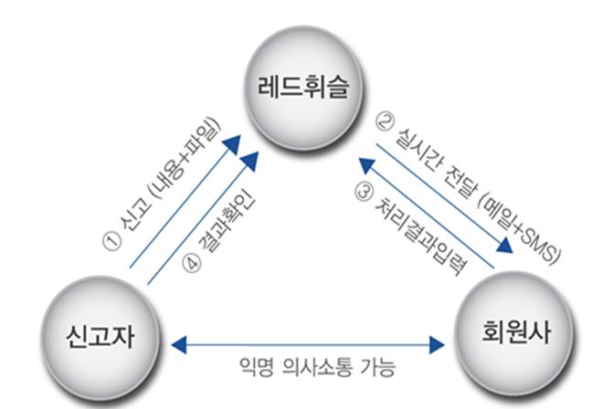 신고자가 PC와 스마트폰을 통해 신고서를 작성·제출하면 보안서버와 보안시스템을 통해 회원사의 담당자에게 해당 내용이 이메일과 SMS로 전달된다.