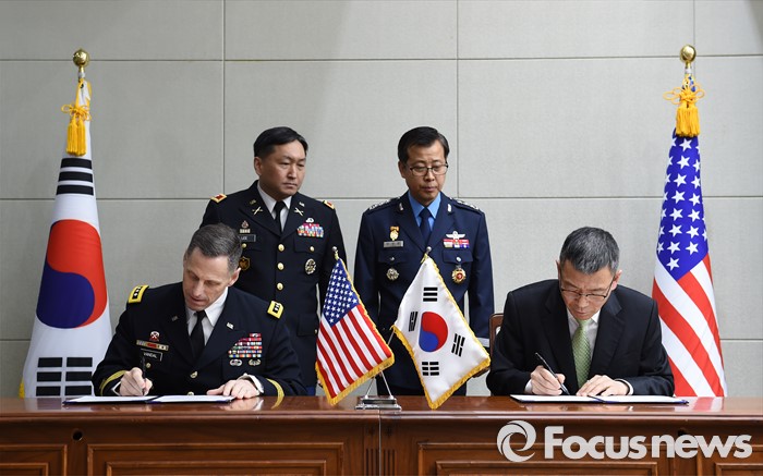 (서울=포커스뉴스) 4일 오전 서울 용산구 국방부에서 류제승 정책실장과 토마스 밴달 미8군 사령관 겸 주한미군사령부 참모장이 주한미군의 사드 배치를 협의하기 위한 한·미 공동실무단 구성 관련 약정에 서명을 하고 있다. <사진제공=국방부>