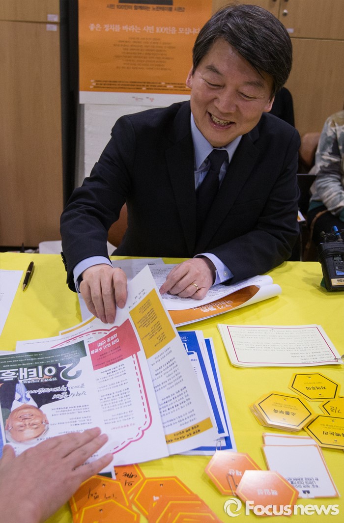 (서울=포커스뉴스) 안철수 국민의당 상임공동대표가 4일 오후 서울 종로구 희망제작소에서 열린 '노란 테이블 시민 토론회' 브리핑에 참석해 이원재 희망제작소 소장의 설명을 듣고 있다.