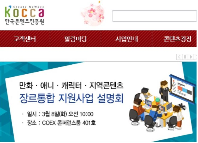 마지막으로 만화 분야에는 약 50억원의 국고가 투입된다. △신인작가 발굴 및 창작 지원을 위한 '신인만화 매니지먼트 지원' △우수 만화연재를 지원하는 '연재만화 제작지원' △만화원작의 웹드라마, 애플리케이션, 게임 등 연계콘텐츠 제작을 지원하는 '만화 연계콘텐츠 제작지원' △유통환경 강화를 위한 '만화플랫폼 지원' 및 '장르 만화잡지 제작지원' 사업 등 국내 만화시장의 다양성을 확보하고 창작기반을 조성하기 위한 지원 프로그램을 운영할 방침이다.한국콘텐츠진흥원은 오는 8일 서울 강남구 코엑스 컨퍼런스룸에서 '만화·애니·캐릭터·지역콘텐츠 장르통합 지원사업 설명회'를 개최한다.<사진출처=한국콘텐츠진흥원>