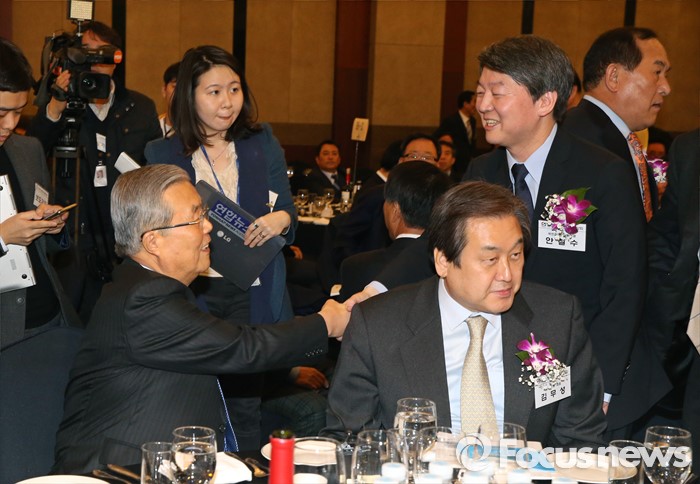(서울=포커스뉴스) 4일 오후 서울 강남구 프리마호텔에서 열린 전국호남향우회 정기총회에 참석한 김무성(오른쪽 아래) 새누리당 대표 뒤로 김종인(왼쪽) 더불어민주당 비대위 대표와 안철수 국민의당 상임공동대표가 악수를 하고 있다.