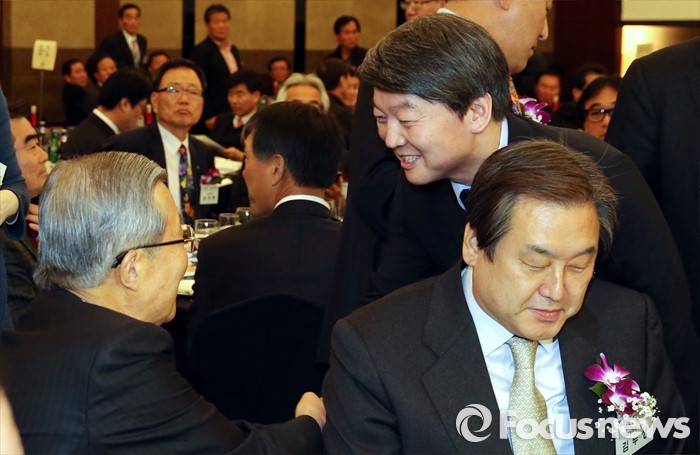 (서울=포커스뉴스) 김종인(왼쪽) 더불어민주당 비대위 대표와 안철수(오른쪽) 국민의당 상임공동대표가 4일 오후 서울 강남구 프리마호텔에서 열린 전국호남향우회 정기총회에 참석해 인사하고 있다. 오른쪽 아래는 김무성 새누리당 대표.