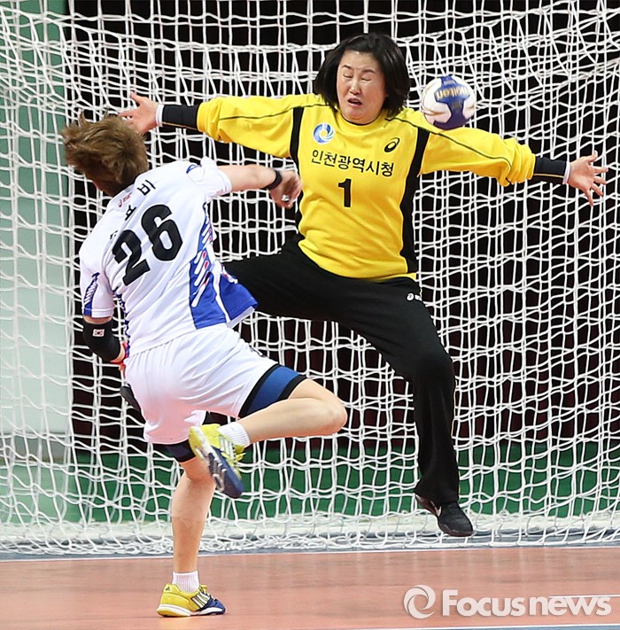 (인천=포커스뉴스) 4일 인천선학체육관에서 열린 2016 SK 핸드볼 코리아리그 여자부 인천시청-광주도시공사 경기에서 인천시청 골키퍼 오영란이 광주도시공사 조효비의 슈팅을 막고 있다.