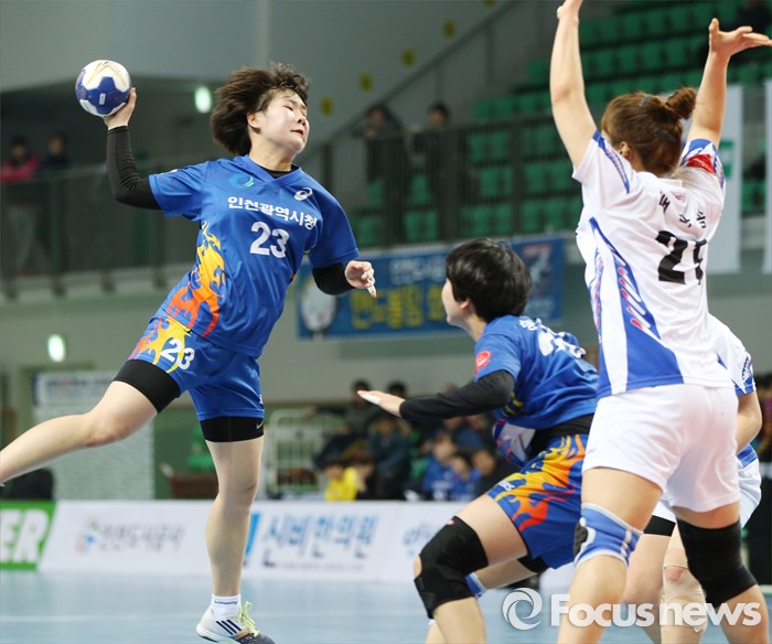 (인천=포커스뉴스) 4일 인천선학체육관에서 열린 2016 SK 핸드볼 코리아리그 여자부 인천시청-광주도시공사 경기에서 인천시청 송지은이 광주도시공사 배다솜의 마크 위로 슈팅하고 있다.