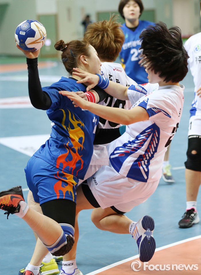 (인천=포커스뉴스) 4일 인천선학체육관에서 열린 2016 SK 핸드볼 코리아리그 여자부 인천시청-광주도시공사 경기에서 인천시청 이현주가 광주도시공사 강경민을 밀면서 슈팅을 시도하고 있다.