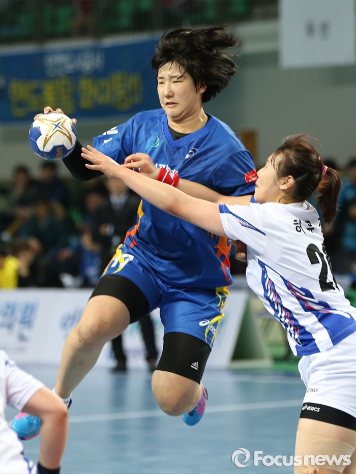 (인천=포커스뉴스) 4일 인천선학체육관에서 열린 2016 SK 핸드볼 코리아리그 여자부 인천시청-광주도시공사 경기에서 인천시청 김희진이 광주도시공사 허유진의 마크를 받고 있다.