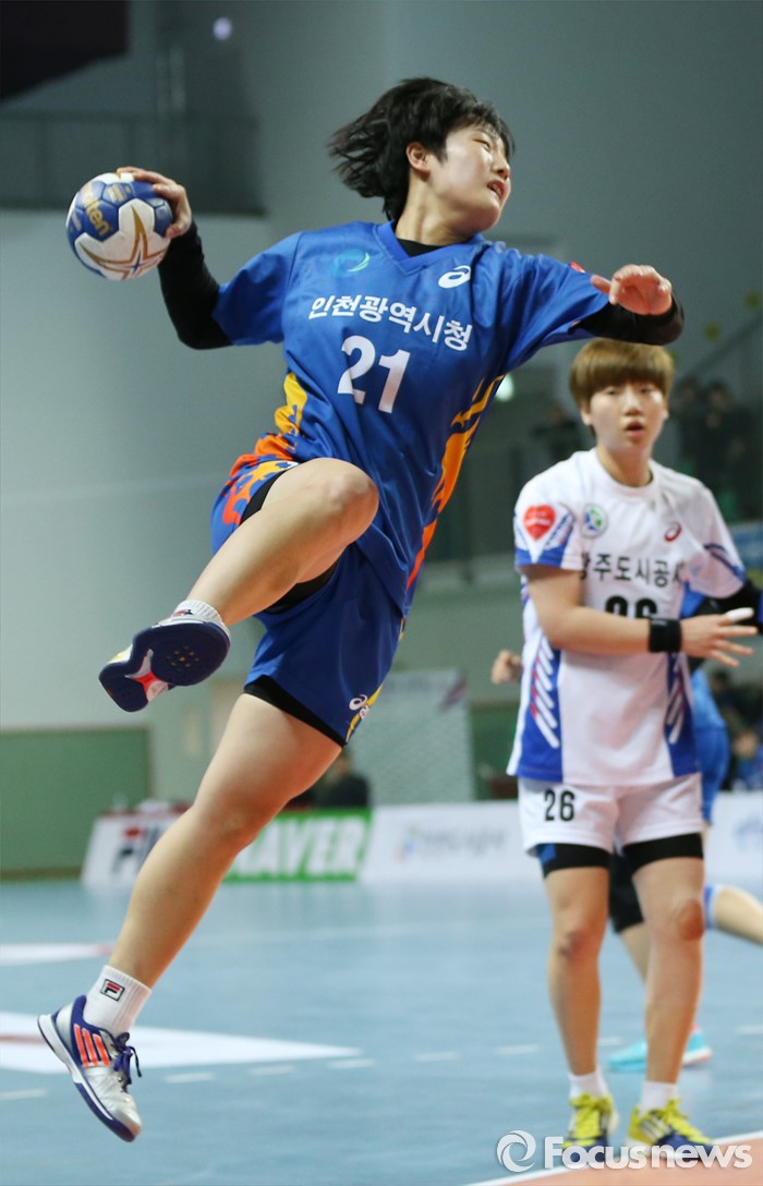 (인천=포커스뉴스) 4일 인천선학체육관에서 열린 2016 SK 핸드볼 코리아리그 여자부 인천시청-광주도시공사 경기에서 인천시청 김성은이 광주도시공사의 수비를 따돌리고 슈팅하고 있다.