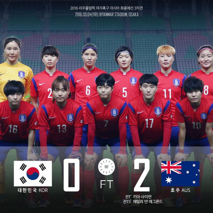 한국은 4일 일본 오사카 얀마스타디움에서 열린 호주와의 2016 리우올림픽 아시아 최종예선 3차전에서 0-2로 졌다. 한국은 전반 1분 키아 사이먼에게 선제골을 내줬다. 전반 14분 에밀리 반-에그몬드에게 페널티 추가골을 허용했다. 한국은 이른 시간 실점하며 어렵게 경기를 시작했고, 추가골까지 내주며 경기운영이 힘겨웠다.