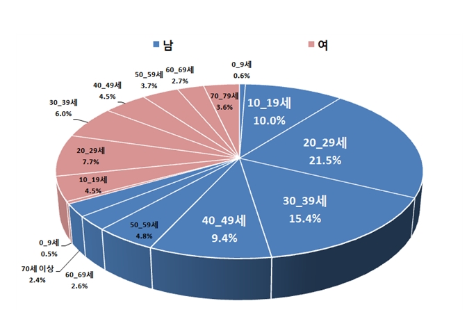 특히, 여성보다 남성 진료인원의 비율이 높았으며, 남성의 20대는 21.5%, 30대는 15.4%였다. 즉, 진료인원 3명 중 1명 이상은 젊은 20~30대 남성이라는 것이다.
