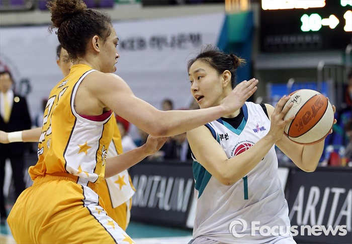 (부천=포커스뉴스) 6일 부천체육관에서 열린 2015-2016 여자프로농구 KEB하나은행-KB스타즈 경기에서 KEB하나 염윤아가 KB스타즈 햄비의 마크를 받으며 패스할 곳을 찾고 있다.