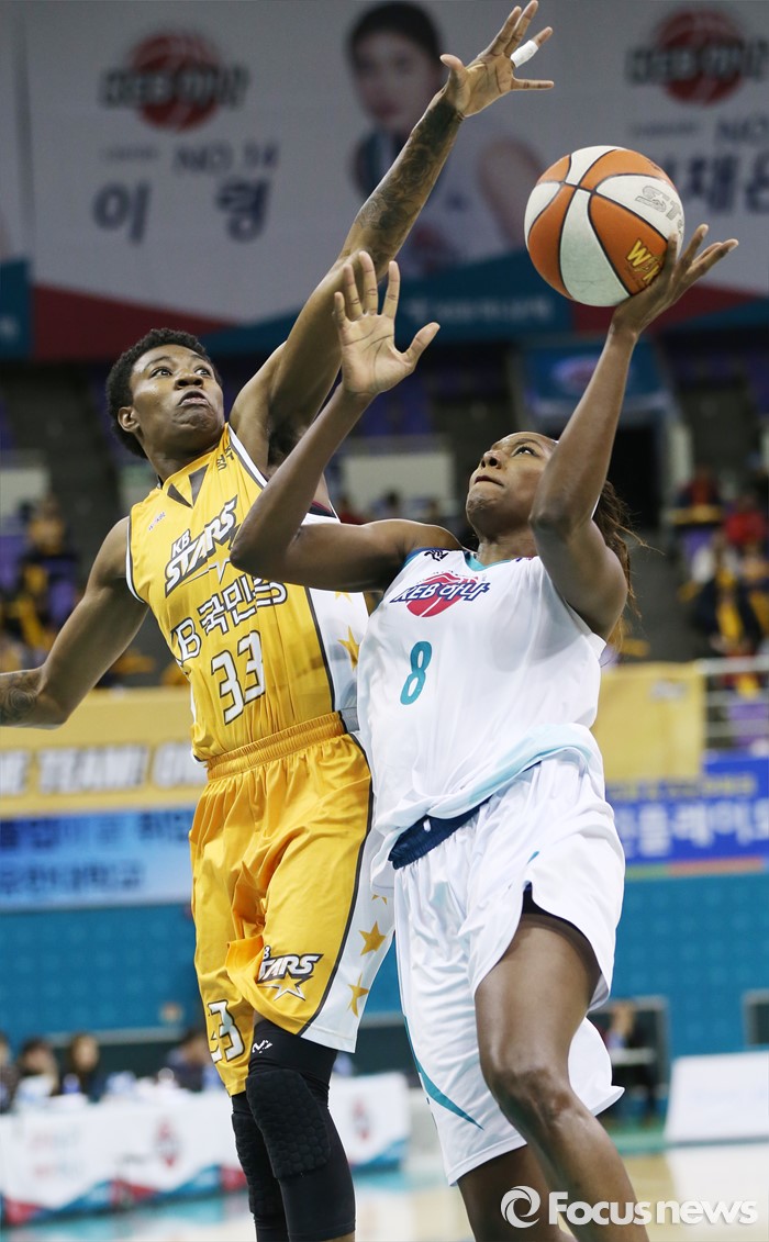 (부천=포커스뉴스) 6일 부천체육관에서 열린 2015-2016 여자프로농구 KEB하나은행-KB스타즈 경기에서 KEB하나 버니스 모스비가 KB스타즈 하워드의 블록을 피하며 레이업슛을 시도하고 있다.