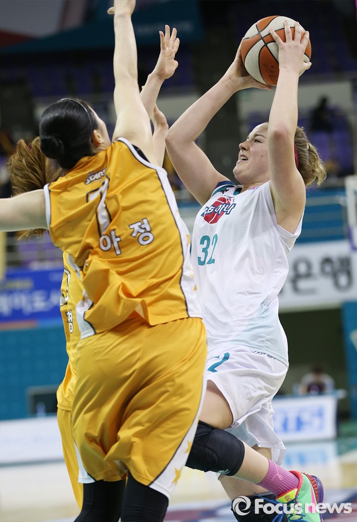 (부천=포커스뉴스) 6일 부천체육관에서 열린 2015-2016 여자프로농구 KEB하나은행-KB스타즈 경기에서 KEB하나 트리샤 리스턴이 KB스타즈 강아정, 김진영의 블록을 피해 점프슛을 시도하고 있다.