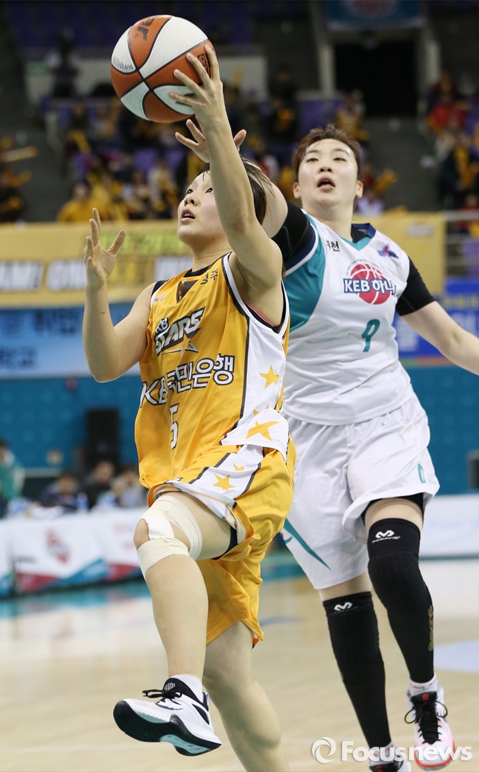 (부천=포커스뉴스) 6일 부천체육관에서 열린 2015-2016 여자프로농구 정규리그 마지막 경기 KEB하나은행-KB스타즈 경기에서 KB스타즈 심성영이 KEB하나 백지은의 마크를 뚫으며 레이업슛을 쏘고 있다.