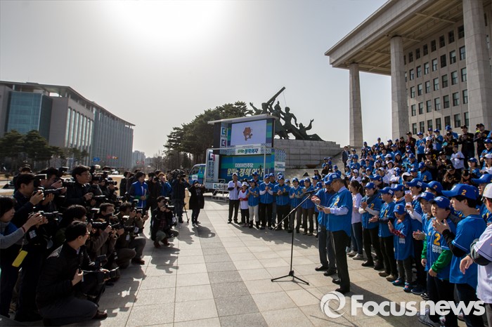 (서울=포커스뉴스) 김종인 더불어민주당 비상대책위원회 대표와 정청래 더불어민주당 의원을 비롯한 당원들이 6일 오후 서울 영등포구 국회 본관 앞에서 열린 '더불어민주당 총선 응원가 뮤직비디오 촬영'에 참여해 응원가를부르고 있다.