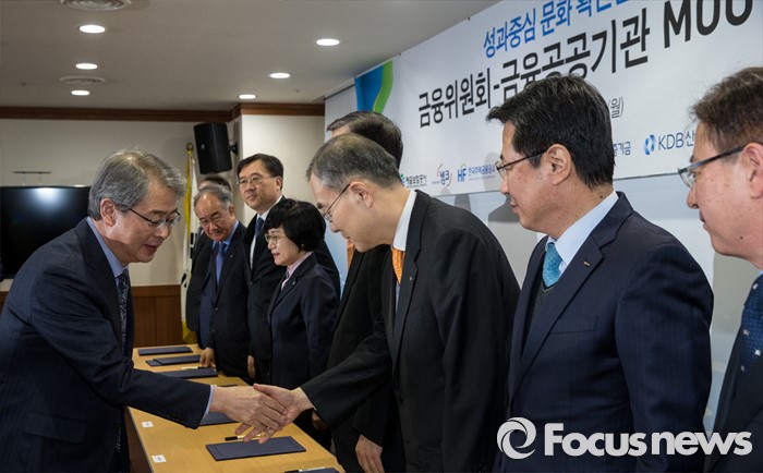 (서울=포커스뉴스) 7일 오전 서울 중구 금융위원회 대회의실에서 열린 '성과중심 문화 확산을 위한 금융위원회-금융공공기관 MOU 체결식'에 참석한 임종룡 금융위원장이 금융공공기관장 및 관계자들과 인사하고 있다.