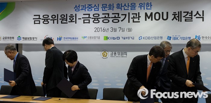 (서울=포커스뉴스) 7일 오전 서울 중구 금융위원회 대회의실에서 열린 '성과중심 문화 확산을 위한 금융위원회-금융공공기관 MOU 체결식'에 참석한 임종룡 금융위원장과 금융공공기관장 및 관계자들이 사진촬영을 위해 자리에서 일어나고 있다.