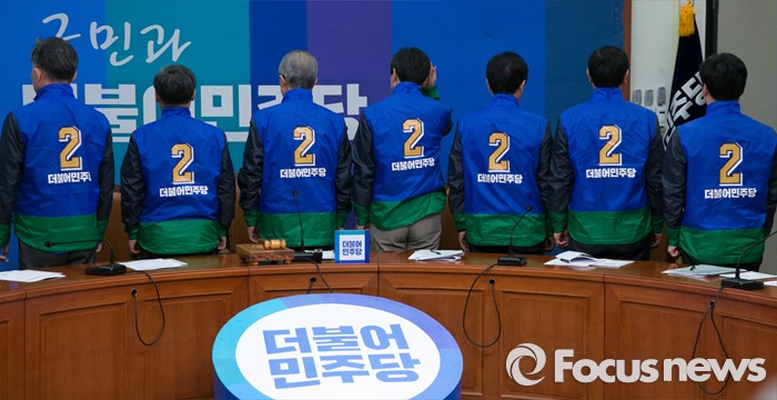 (서울=포커스뉴스) 김종인 더불어민주당 비대위 대표와 비대위원들이 7일 오전 서울 여의도 국회에서 비상대책위원회의에 앞서 20대 총선용 유니폼을 입고 취재진을 향해 포즈를 취하고 있다. 왼쪽부터 표창원, 우윤근 비대위원, 김 대표, 이종걸 원내대표, 변재일, 이용섭, 김병관 비대위원.