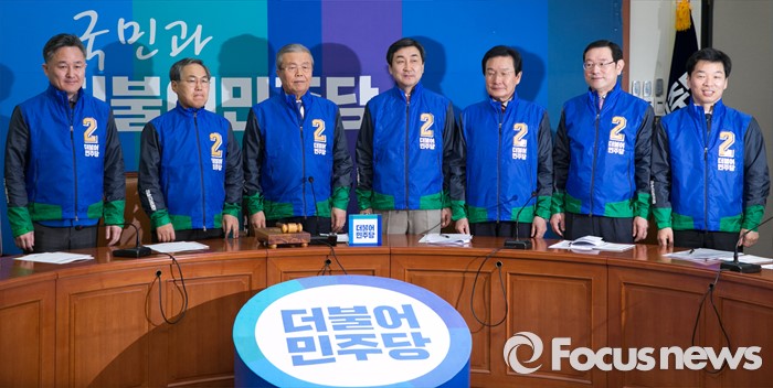 (서울=포커스뉴스) 김종인 더불어민주당 비대위 대표와 비대위원들이 7일 오전 서울 여의도 국회에서 비상대책위원회의에 앞서 20대 총선용 유니폼을 입고 취재진을 향해 포즈를 취하고 있다. 왼쪽부터 표창원, 우윤근 비대위원, 김 대표, 이종걸 원내대표, 변재일, 이용섭, 김병관 비대위원.