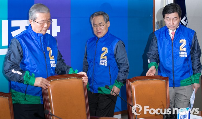 (서울=포커스뉴스) 김종인(왼쪽부터) 더불어민주당 비대위 대표, 우윤근 비대위원, 이종걸 원내대표가 7일 오전 서울 여의도 국회에서 열린 비상대책위원회의에 20대 총선용 유니폼을 입고 참석하고 있다.