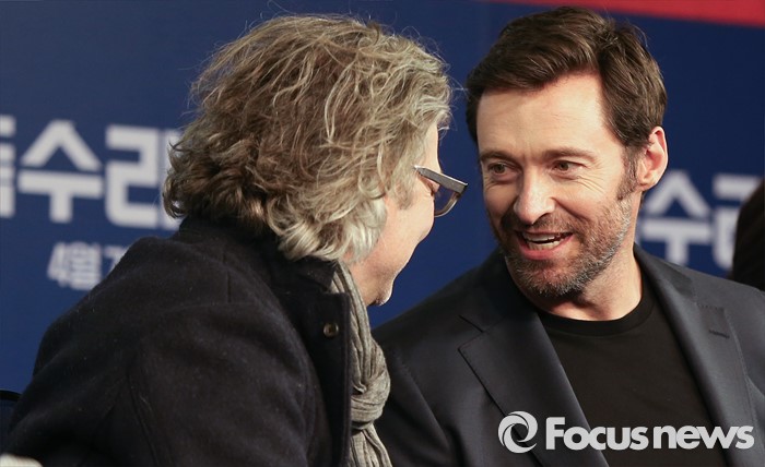 (서울=포커스뉴스) 7일 오전 서울 종로구 포시즌스 호텔 서울에서 열린 영화 '독수리 에디' 기자간담회에 참석한 영화감독 덱스터 플레처(왼쪽)와 배우 휴 잭맨이 대화를 나누고 있다.