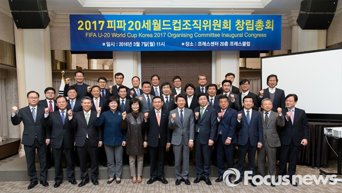 (서울=포커스뉴스) 7일 오전 서울 중구 프레스센터에서 2017 피파 20세 월드컵조직위원회 창립총회에 참석한 정몽규(앞줄 오른쪽 여섯번째) 대한축구협회장과 위원들이 기념촬영을 하고 있다.
