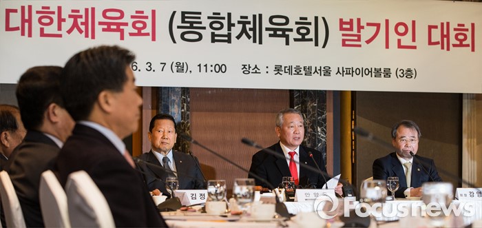 (서울=포커스뉴스) 7일 서울 중구 롯데호텔앤리조트 서울에서 열린 '대한체육회(통합체육회) 발기인 대회'에서 안양옥(오른쪽 두번째) 체육단체 통합준비위원장이 인사말을 하고 있다.