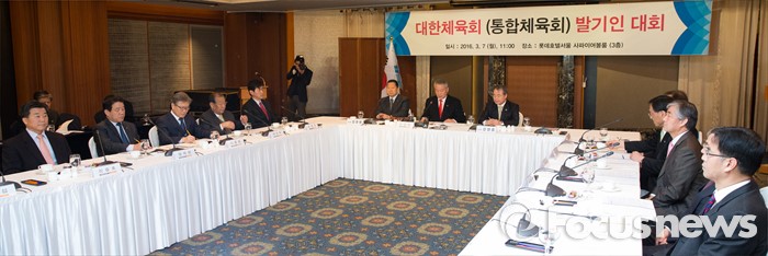 (서울=포커스뉴스) 7일 서울 중구 롯데호텔앤리조트 서울에서 열린 '대한체육회(통합체육회) 발기인 대회'에서 안양옥 체육단체 통합준비위원장이 인사말을 하고 있다.