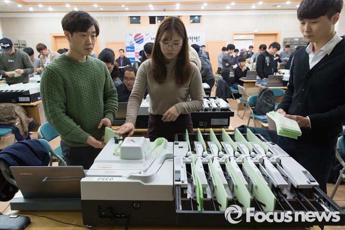 (서울=포커스뉴스) 제20대 총선을 한 달여 앞둔 7일 오후 서울 종로구 중앙선거관리위원회 선거연수원에서 투표지 분류기 담당자들이 장비점검 및 개표관리 실습교육을 하고 있다.