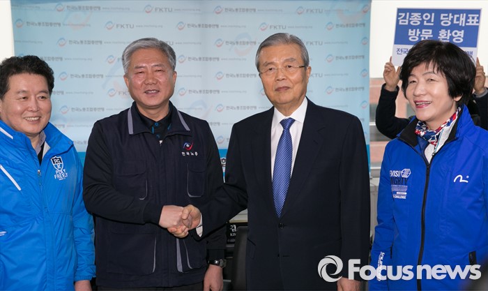 (서울=포커스뉴스) 김종인 더불어민주당 비대위 대표가 7일 오후 서울 영등포구 한국노동조합총연맹을 방문해 김동만 위원장과 악수하며 취재진을 향해 포즈를 취하고 있다. 오른쪽부터 김영주 국회 환경노동위원장, 김 대표, 김 위원장, 김경협 의원.