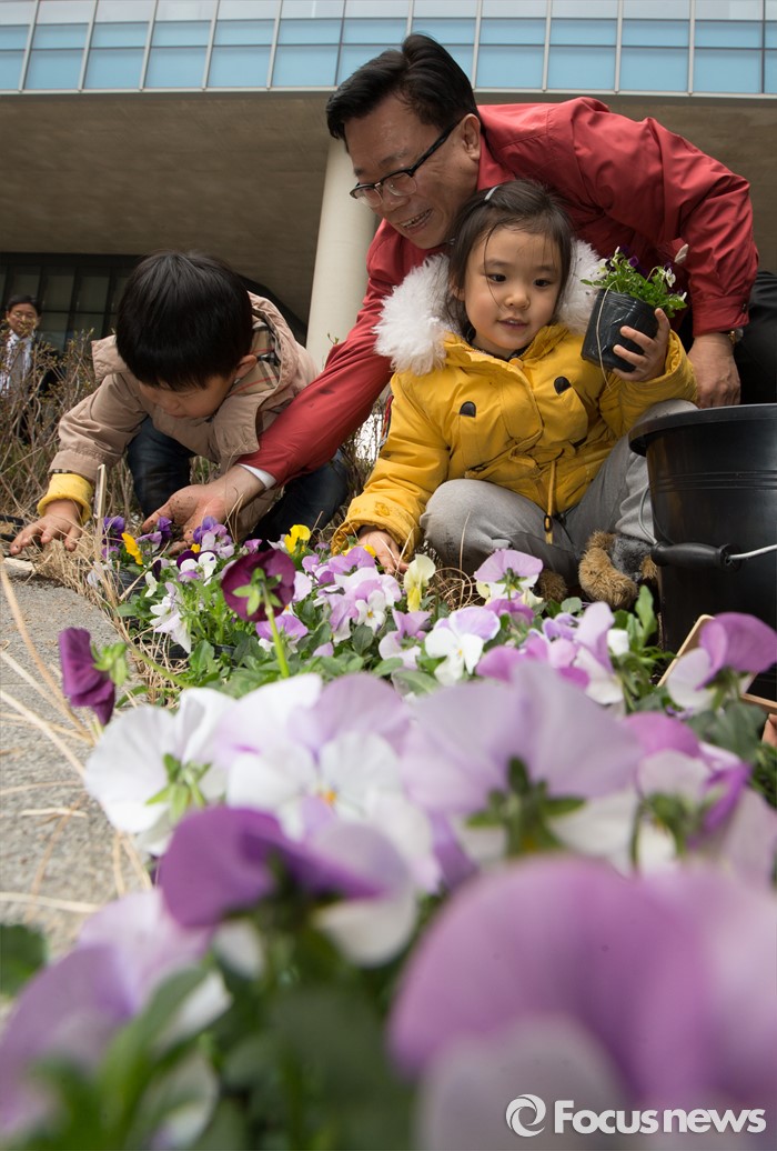 (세종=포커스뉴스) 7일 오후 세종시 정부세종청사 농림축산식품부 앞 다솜동산에서 이동필 농림축산식품부장관이 어린이들과 튤립 및 백합의 구근과 팬지를 심고 있다.