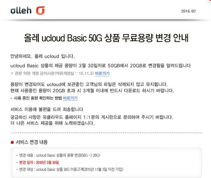 7일 KT에 따르면 유클라우드 베이직 상품의 제공 용량이 30일자로 50GB에서 20GB로 변경된다. KT는 공지를 통해 ‘현재 사용 중인 용량이 20GB 초과 시 3개월 이내 다운로드 하길 바란다’고 알렸다.