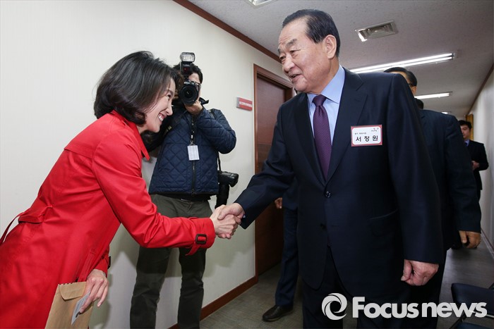 (서울=포커스뉴스) 서청원 새누리당 최고위원(경기 화성갑)이 7일 오후 서울 여의도 당사에서 열린 공천 면접에서 경쟁자인 리은경 예비후보와 악수를 나누고 있다.