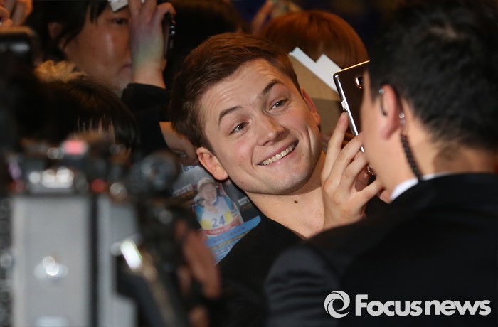 (서울=포커스뉴스) 7일 오후 서울 영등포구 IFC몰 광장에서 열린 영화 '독수리 에디' 레드카펫 행사에 참석한 배우 태론 에거튼이 팬들과 기념 촬영을 하고 있다.