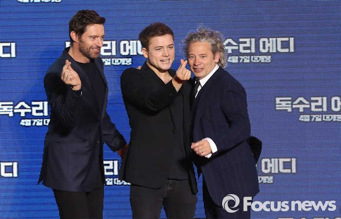 (서울=포커스뉴스) 7일 오후 서울 영등포구 IFC몰 광장에서 열린 영화 '독수리 에디' 레드카펫 행사에 참석한 배우 휴 잭맨(왼쪽부터), 태론 에거튼, 덱스터 플레처 감독이 포토타임을 갖고 있다.