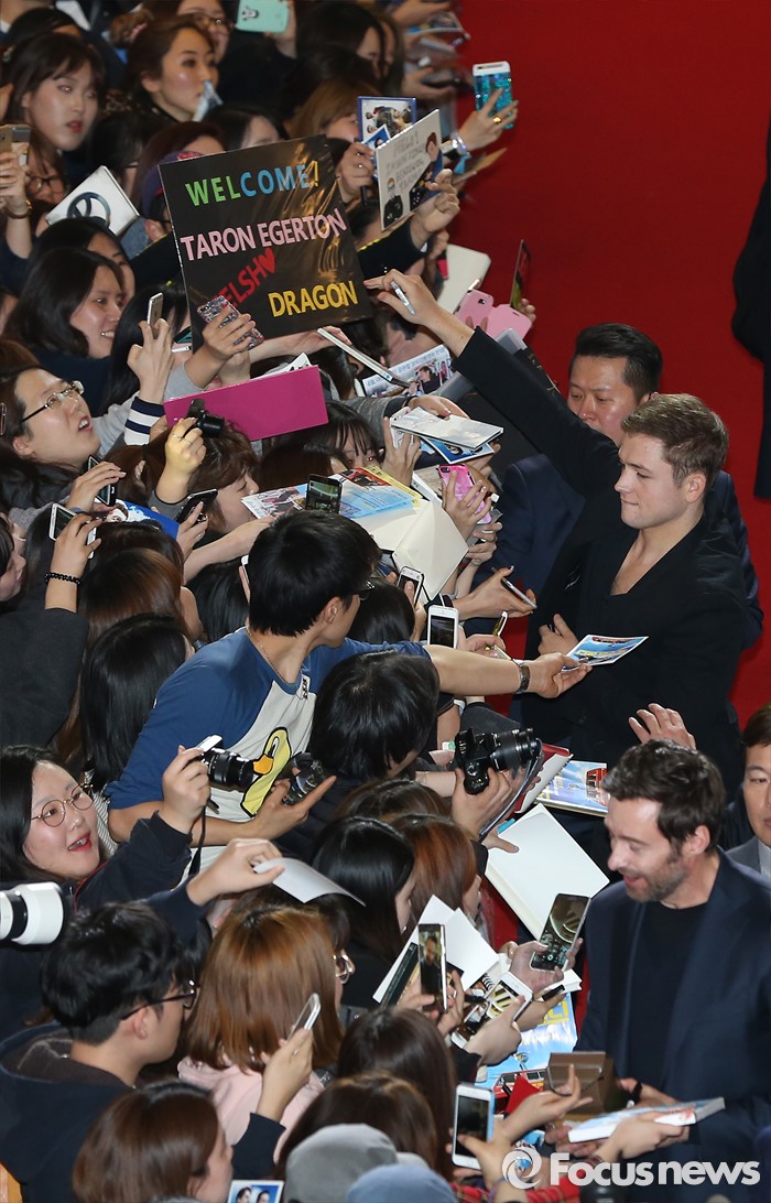 (서울=포커스뉴스) 7일 오후 서울 영등포구 IFC몰 광장에서 열린 영화 '독수리 에디' 레드카펫 행사에 참석한 배우 태론 에거튼이 팬들에게 사인을 해주고 있다.