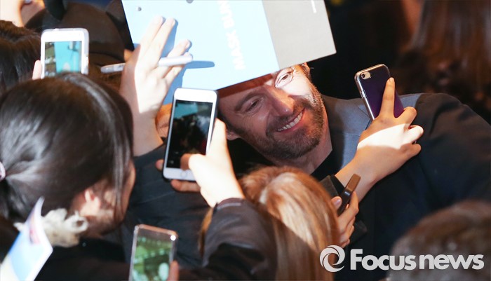 (서울=포커스뉴스) 7일 오후 서울 영등포구 IFC몰 광장에서 열린 영화 '독수리 에디' 레드카펫 행사에 참석한 배우 휴 잭맨이 팬들과 사진을 찍고 있다.