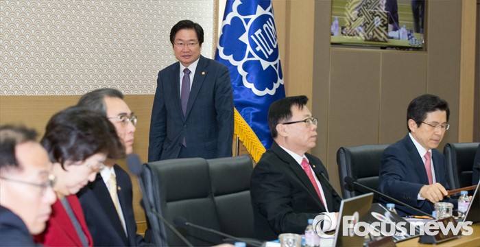 (세종=포커스뉴스) 8일 오전 세종시 정부세종청사 국무회의장에서 서울-세종 영상회의로 열린 국무회의에 지각한 김영석 해양수산부 장관이 자리를 찾지 못하고 있다.