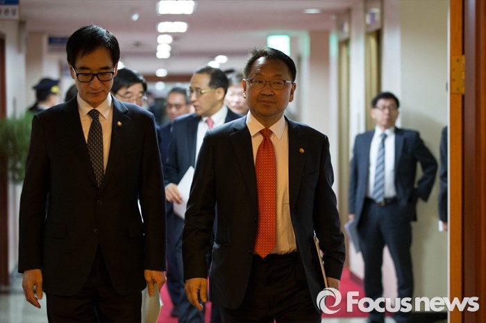 (서울=포커스뉴스) 이준식(왼쪽) 사회부총리 겸 교육부 장관과 유일호(오른쪽) 경제부총리 겸 기획재정부 장관이 8일 오전 서울 세종로 정부서울청사에서 열린 국무회의에 참석하고 있다. 2016-03-08