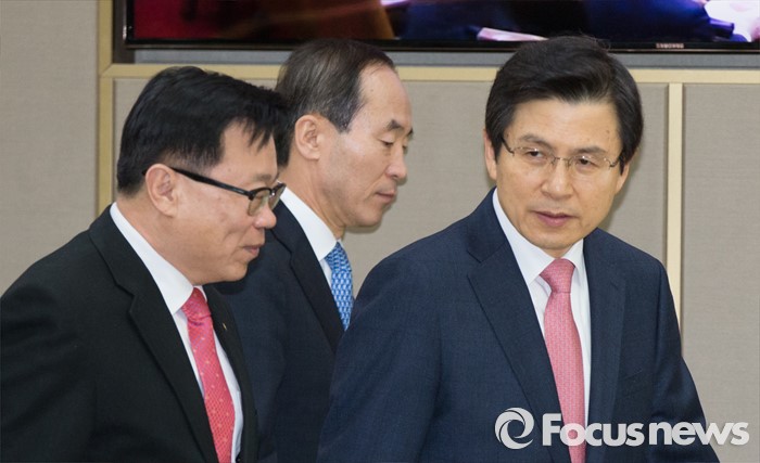 (세종=포커스뉴스) 황교안(오른쪽) 국무총리가 이동필(왼쪽) 농림축산식품부장관과 8일 오전 세종시 정부세종청사 국무회의장에서 서울-세종 영상회의로 열린 국무회의에 입장하며 대화하고 있다. 가운데는 윤성규 환경부 장관.