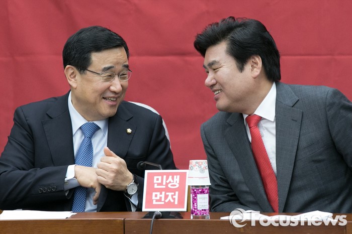 (서울=포커스뉴스) 원유철(오른쪽) 새누리당 원내대표와 김정훈 정책위의장이 8일 오전 서울 여의도 국회에서 열린 원내대책회의에 참석해 대화하고 있다.
