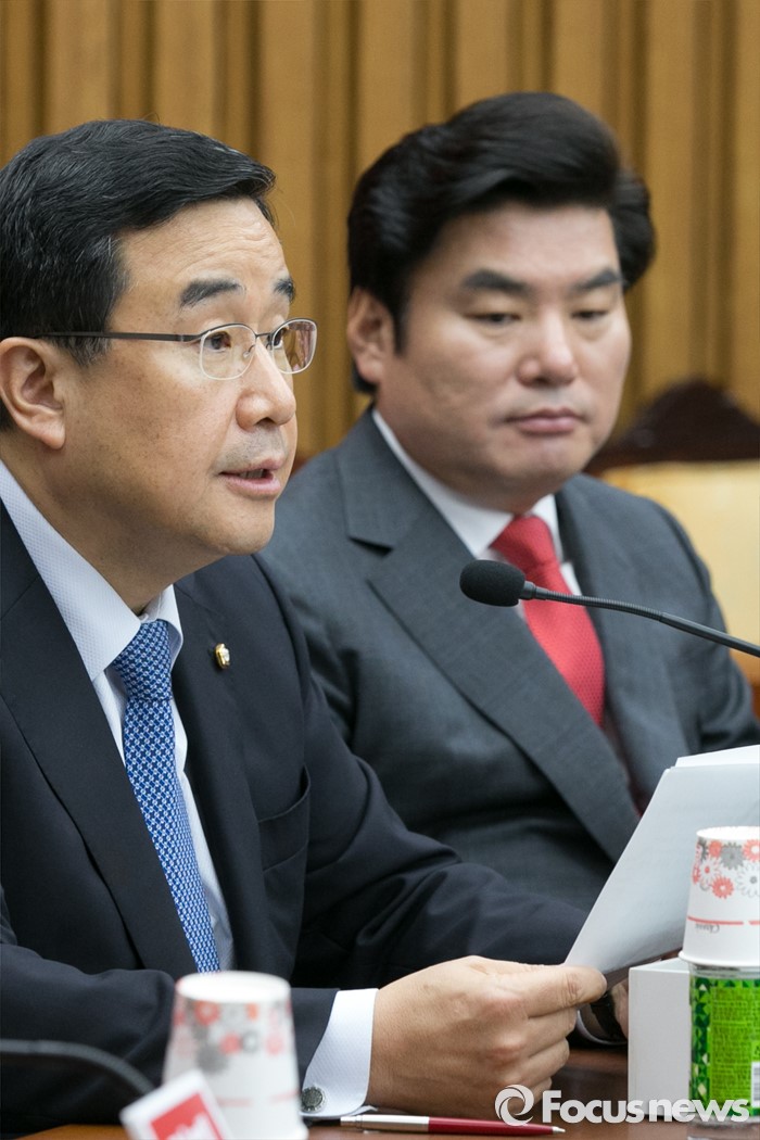 (서울=포커스뉴스) 김정훈(왼쪽) 새누리당 정책위의장이 8일 오전 서울 여의도 국회에서 열린 원내대책회의에 참석해 발언하고 있다.