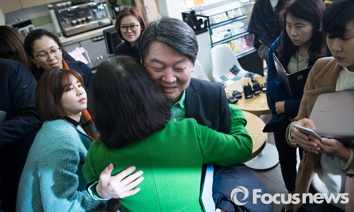 (서울=포커스뉴스) 안철수 국민의당 상임공동대표가 8일 오전 서울 노원구 도봉운전면허시험장 내 카페에서 노원병 출마선언 기자회견을 마친 후 한 지지자와 포옹을 하고 있다.