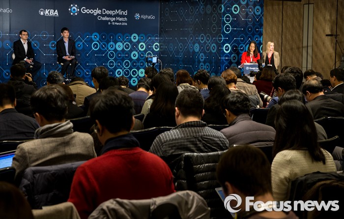 (서울=포커스뉴스) 8일 오전 서울 종로구 새문안로 포시즌스호텔에서 열린 '구글 딥마인드 챌린지 매치' 내ㆍ외신 합동 기자회견에 참석한 데미스 하사비스 구글 딥마인드 최고경영자와 이세돌 9단이 취재진의 질문에 답하고 있다.